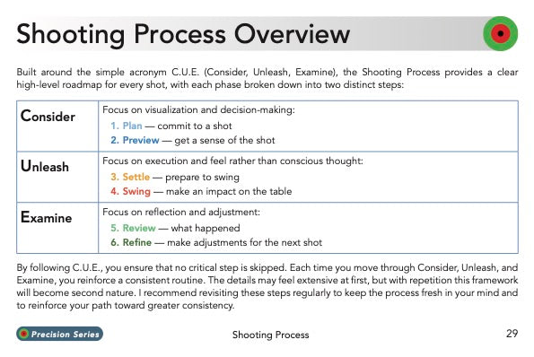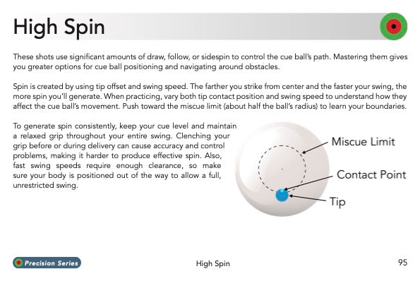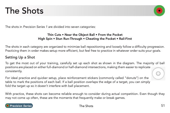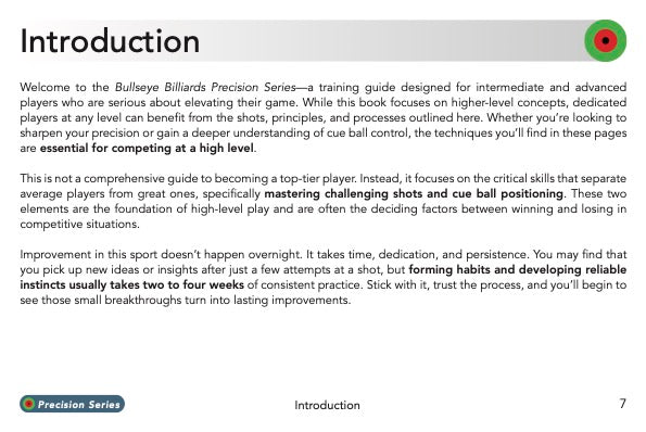 Precision Series Volume 1 delivers 100 challenging cue ball positioning shots designed for intermediate and advanced players ready to elevate their game. Each shot includes clear diagrams, precise coaching guidance, and a proven scoring system using the Bullseye Billiards target.