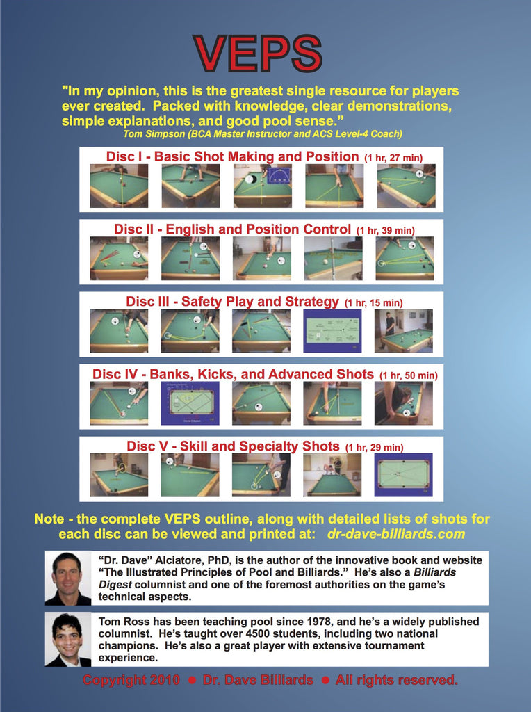 Watch Dr. Dave and Tom Ross show you the details on 750 different types of shots and 250 "gems of pool" in the Video Encyclopedia of Pool Shots (VEPS). This 5-DVD video series contains the most comprehensive set of shots of any instructional video series in the world.